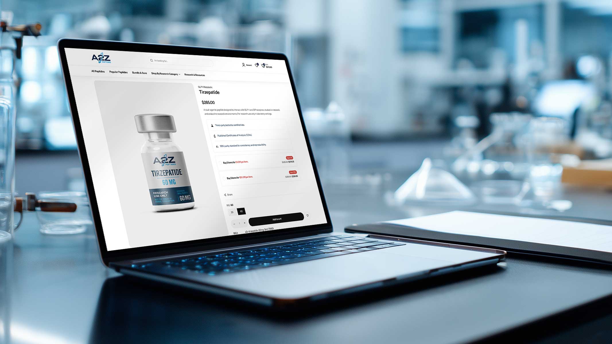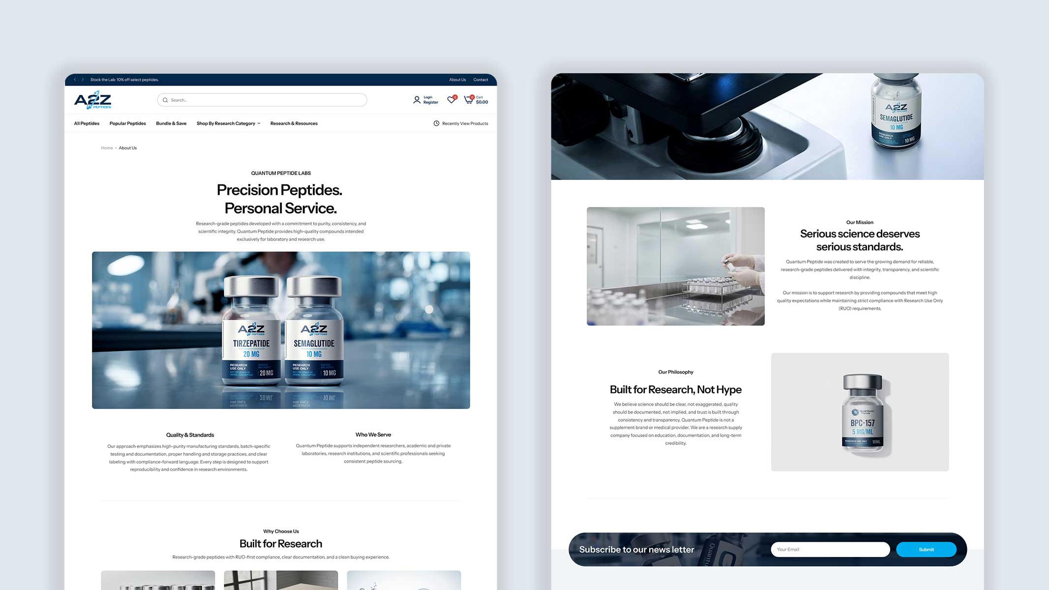 A2Z Peptides partnered with Sol Agency to launch a research peptide e-commerce brand from the ground up. The project required more than a storefront — it demanded a secure, scalable infrastructure capable of handling high-risk payment processing, inventory synchronization, compliance-forward messaging, and subscription-ready architecture.