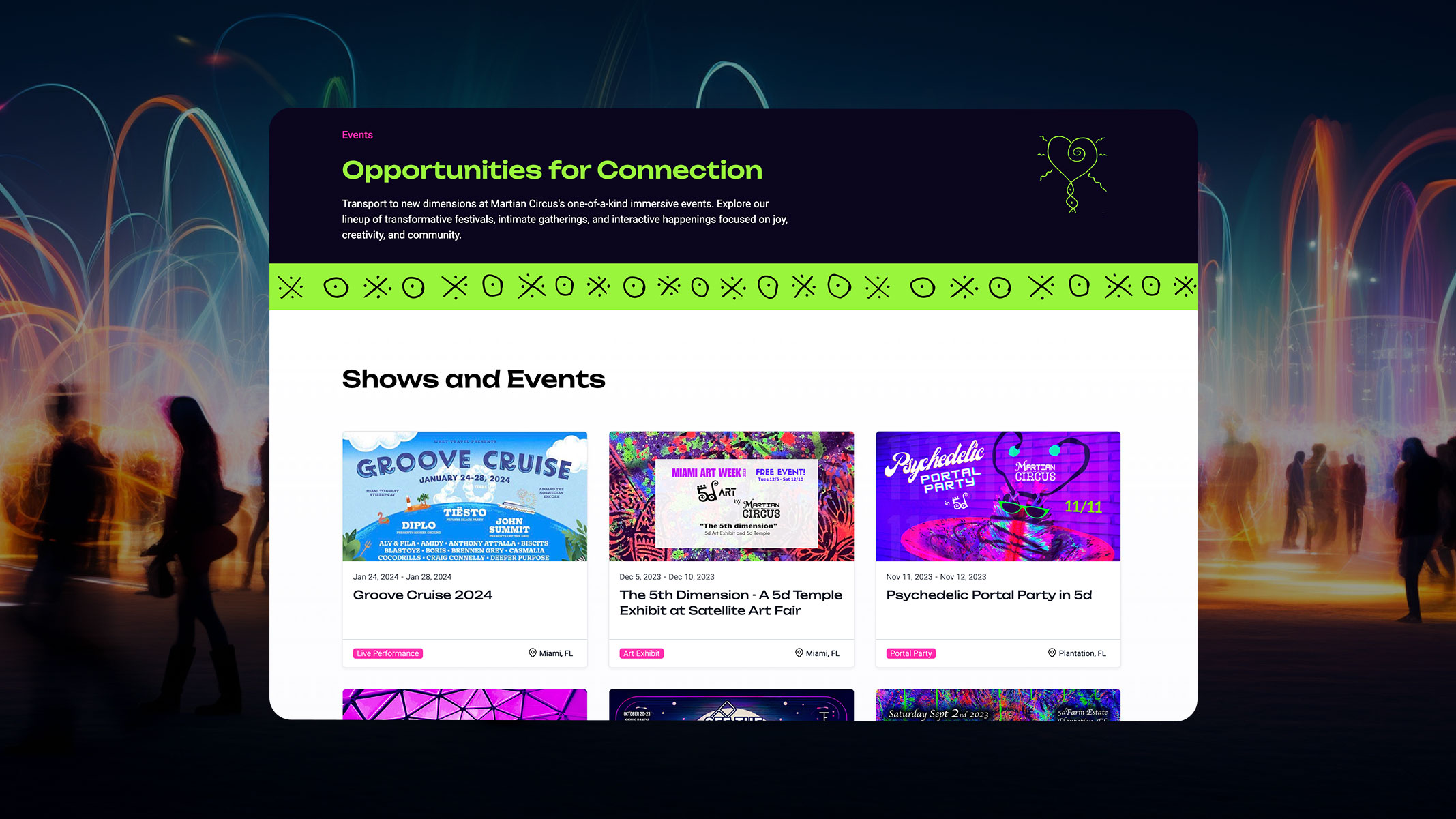 Martian Circus approached us seeking to elevate their brand to increase bookings and be taken more seriously as an entertainment offering that provides strong value. Though they had built a cult following for their imaginative events in certain regions, converting that to major festival and venue partnerships posed a challenge.